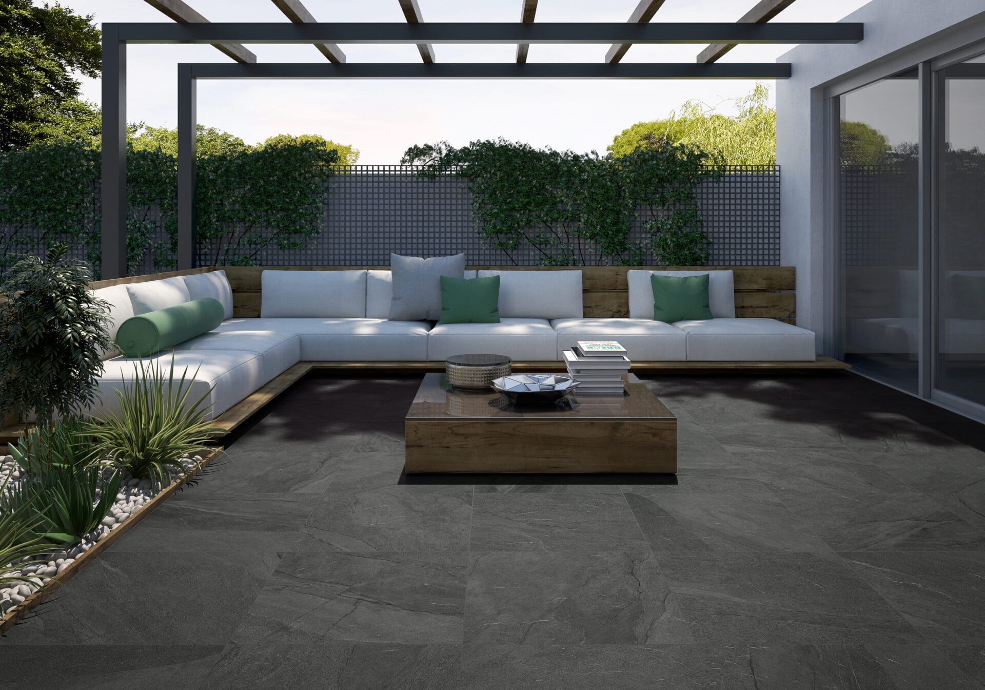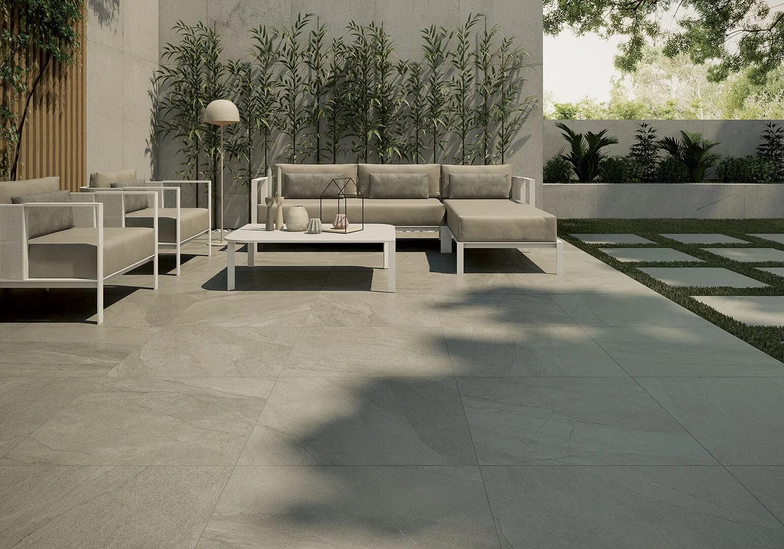 A bold statement in contemporary outdoor design, where durability meets refined aesthetics. Crafted with a keen eye for modernity, featuring a sophisticated stone-inspired texture, layered with subtle tonal variations that mimic the organic movement of natural surfaces. Create a sense of grandeur and spatial rhythm, perfect for all external areas.