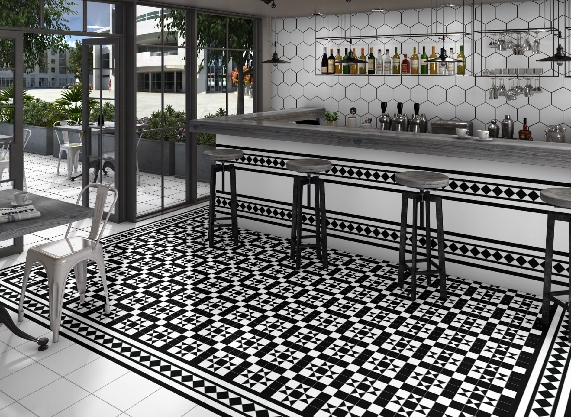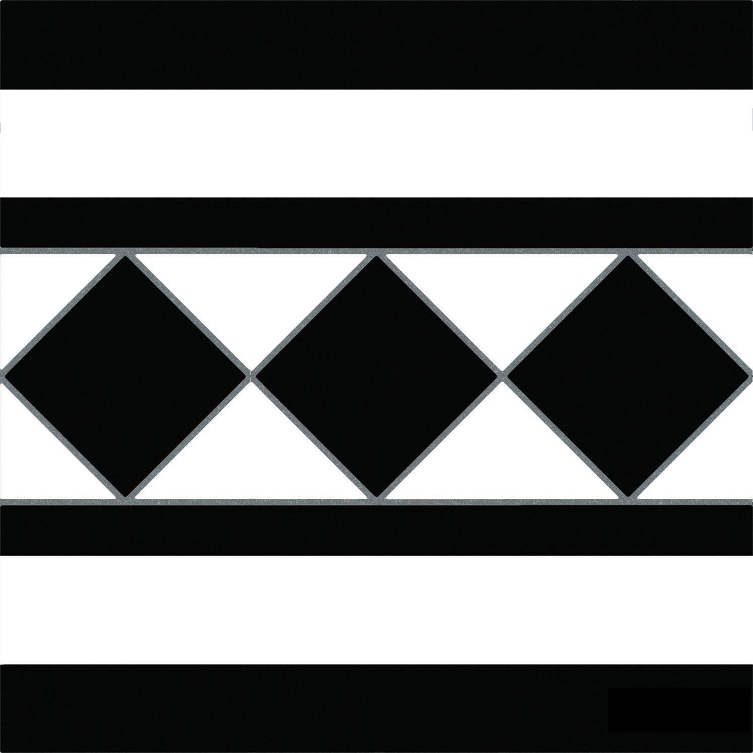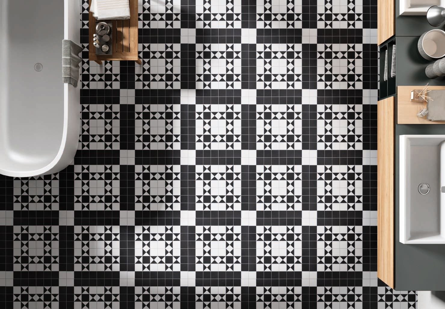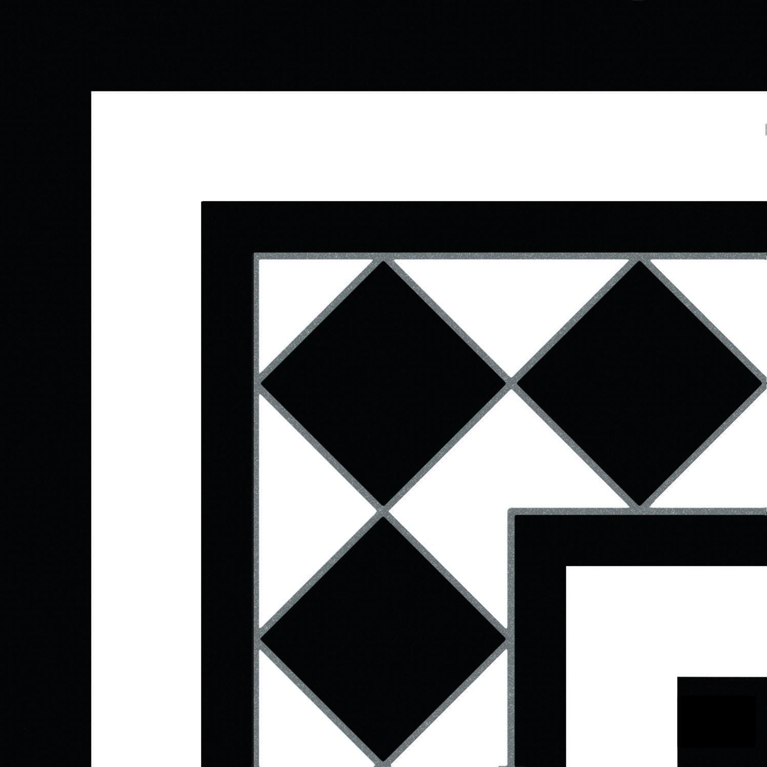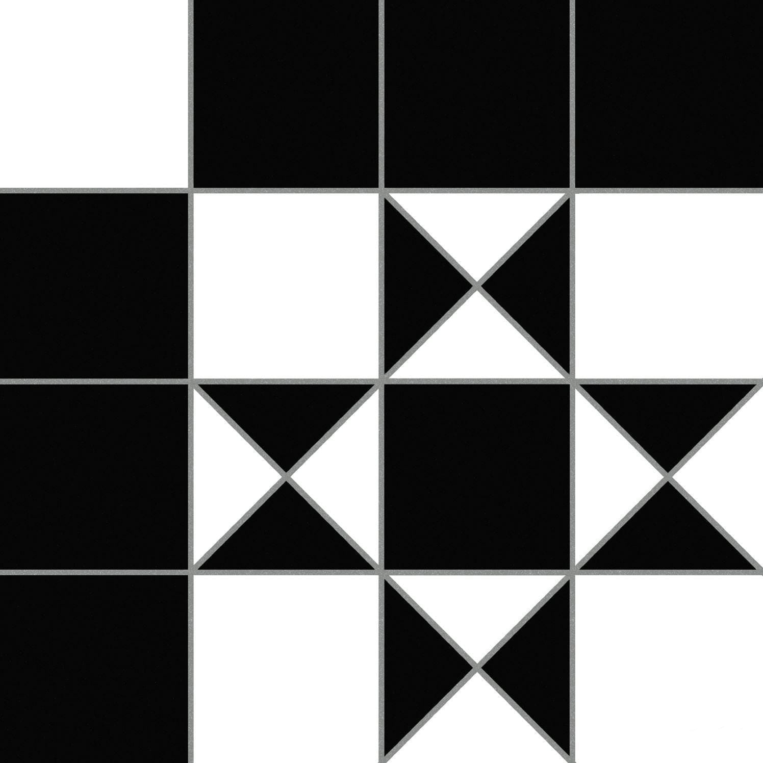 This striking black-and-white tile features a bold geometric pattern, adding a touch of classic elegance and modern contrast to any space.