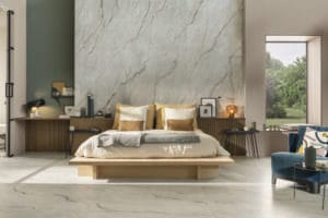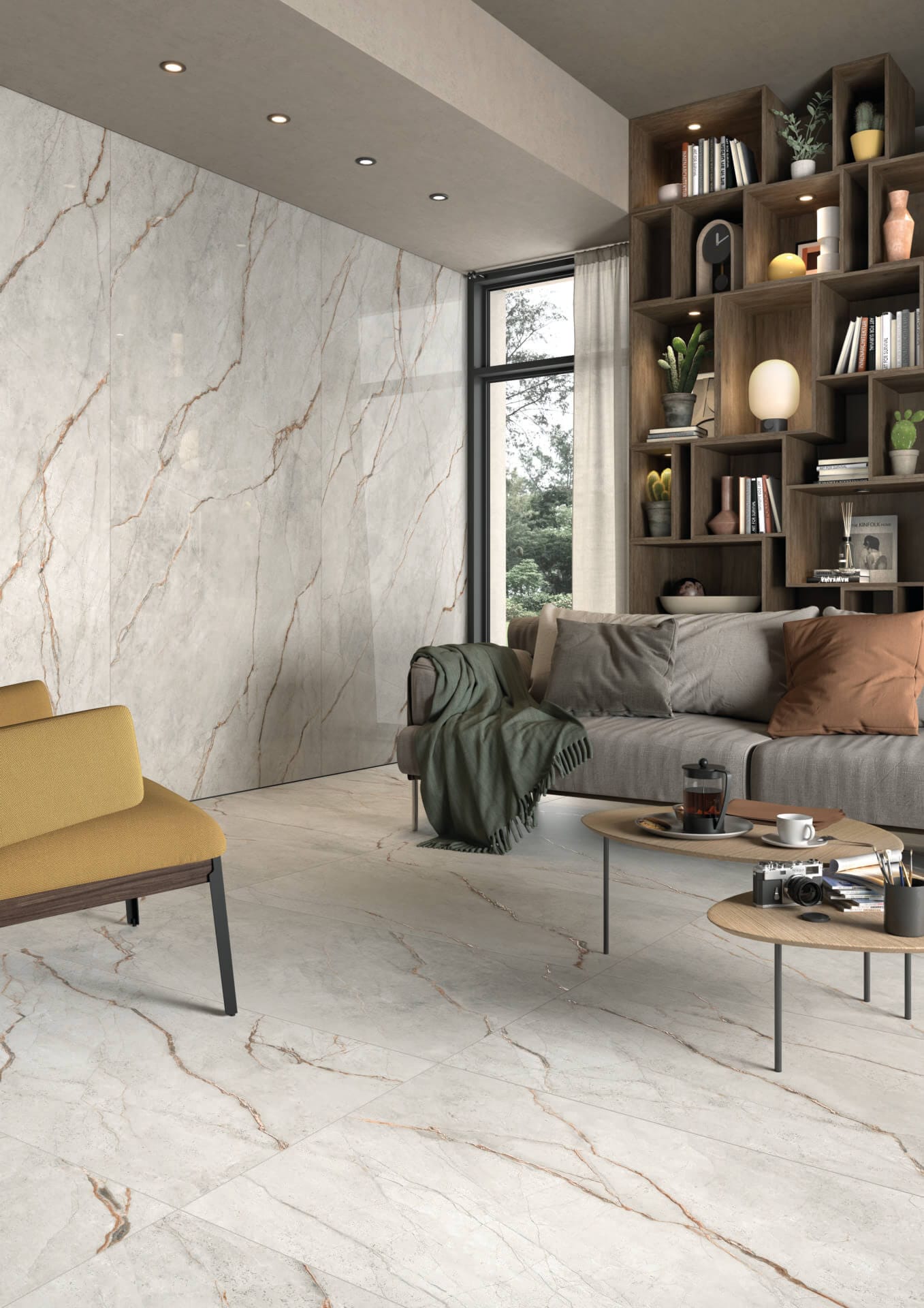 Inspired by Anatolian marble, this 6mm glazed porcelain features a shimmering silver-grey background enriched with blended white and grey tones. Warm ripple and crack effect in shades of gold and cream create a striking contrast, exuding elegance and a regal charm.
