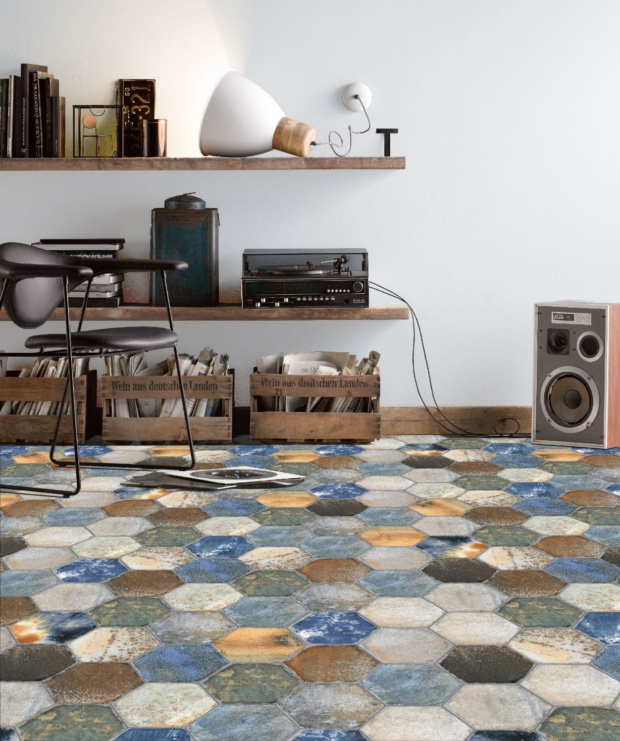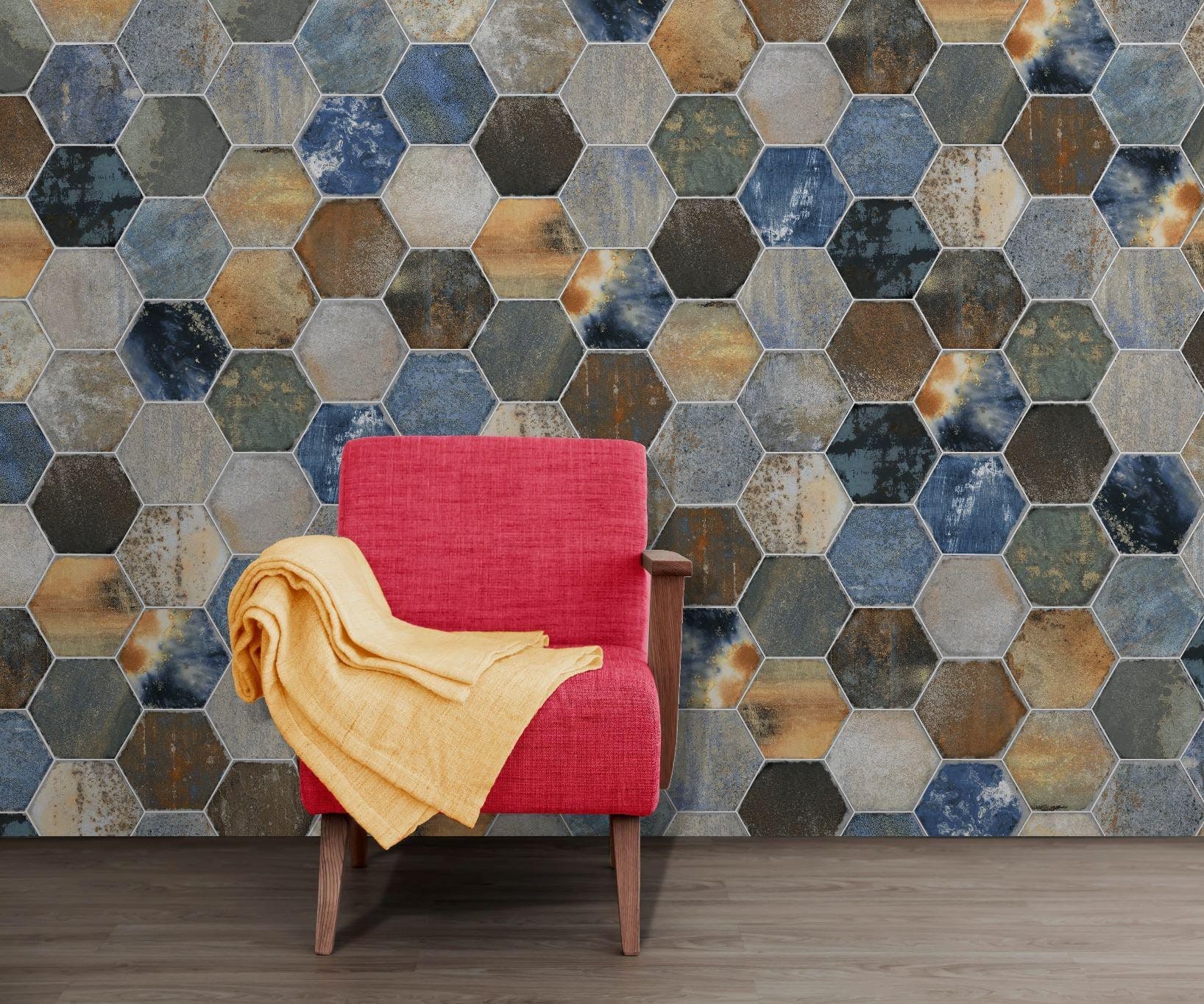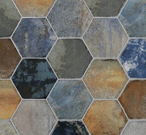bringing a bold, industrial charm to any space with its rich blend of deep blues, rust tones, and weathered metallic effects. Its hexagonal shape adds a modern edge, while the textured, multi-tonal finish creates depth and character.