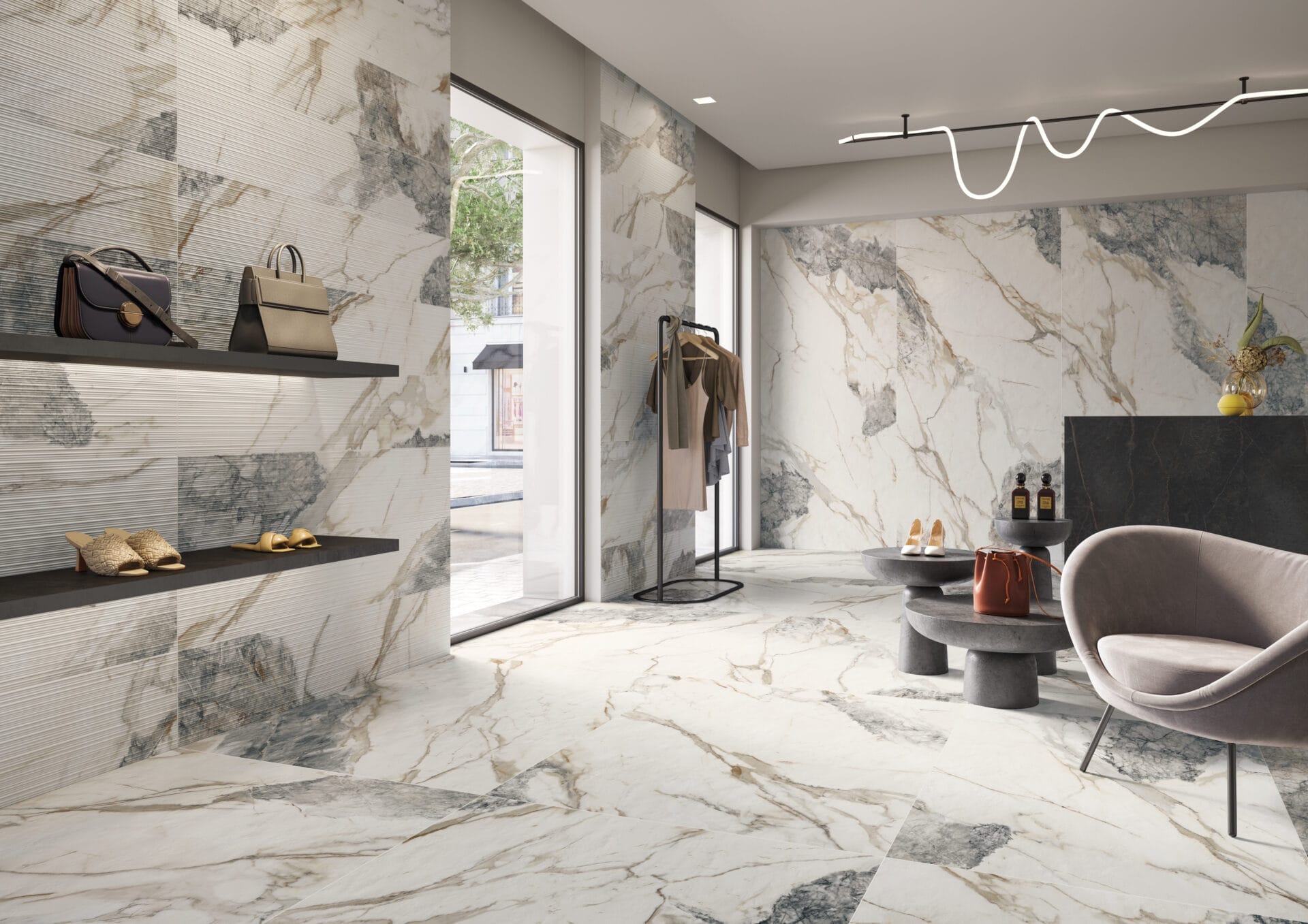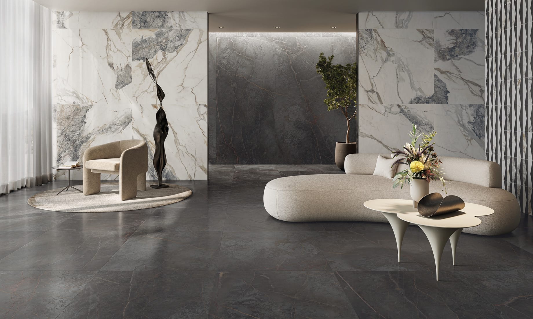 Blending the elegance of veined stone and marble with rich colours and refined texture invites bold design combinations, transforming walls, floors, and furniture into striking statements of style.